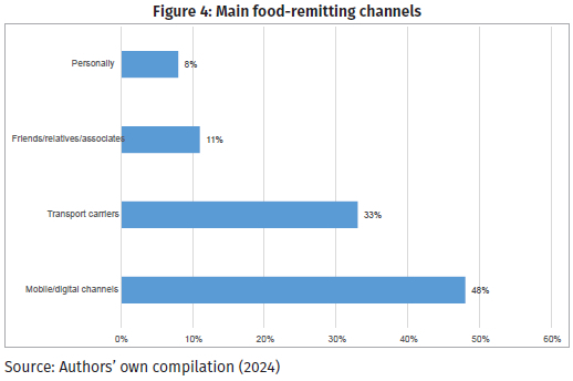 Other channels included transport carriers (malayishas, buses, and vans) (33%), friends, acquaintances or kin (11%), and personally (8%) (see Figure 4). To address the pandemic disruptions in the transfer of remittances, the participants' coping strategies included unusual pathways for transmitting cross-border food transfers. For instance, a Zimbabwean migrant stated: