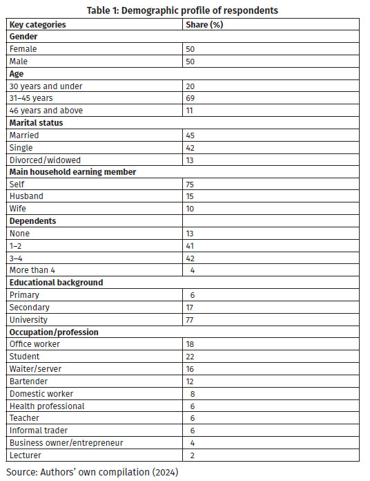 The demographic profile of the 100 food-remitting Zimbabwean migrants who participated in this research is summarized in Table 1. The profile of the participants demonstrated widespread diversity in terms of age (ranging from 23 to 60 years), gender, marital status, dependents (the majority had at least two), education (77% had university qualifications), and occupation (office workers, teachers, lecturers, health professionals, and blue-collar workers - including informal traders and domestic workers). Table 1 shows that a majority of the participants (75%) were de facto household heads and primary earning members of their households. The in-depth interviews were based on accounts from 10 Zimbabwean migrants (six males and four females), and their ages ranged between 27 and 59. The participants' occupations included office workers, teachers, lecturers, postgraduate students, gardeners, waiters (servers), and bartenders.