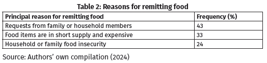 Survey participants were asked to indicate their primary determinants for transferring food to Zimbabwe (see Table 2). A significant proportion, comprising 43% of respondents, reported that their primary reason was to satisfy requests for food from households and family members residing in Zimbabwe. Additionally, one-third (33%) of the participants indicated that their motivations stemmed from the scarcity of essential commodities and the elevated prices of food items in local markets in Zimbabwe. Almost a quarter (24%) of participants sent food to alleviate the food insecurity of their families and households in Zimbabwe.