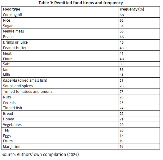 The prolonged economic challenges (including the food crisis) in Zimbabwe are characterized by widespread food insecurity, food shortages, hyperinflation or skyrocketing food prices, non-compliance with price control measures, considerable and recurrent disruptions in regular food distribution and circulation processes and ravaged national and local food systems (Ramachandran et al., 2022; Moyo 2024). The COVID-19 pandemic, lockdowns, travel bans, and prohibition of public gatherings in Zimbabwe limited the regular operation of agricultural extension services, food supply (transportation of agricultural produce to markets) and disrupted agricultural and food markets (Muvhuringi et al., 2021; Mapfumo et al., 2022). The COVID-19 pandemic and lockdown phases in Zimbabwe were related to surges in food prices, disrupted diet and consumption patterns, and reduction in dietary diversity (Matsungo and Chopera, 2020; Murendo et al., 2021). Thus, cross-border food transfers provide an essential source of food and groceries to cushion households back in Zimbabwe with limited access to food or during periods of economic shocks and food shortages. Chikanda and Tawodzera (2017) also show that for many cross-border traders and migrants, it is substantially cheaper to purchase goods and groceries in South Africa and transport them to Zimbabwe. This study illustrates that Zimbabwean migrants transfer a wide range of food and grocery items, including staple foods in Zimbabwe, grain-based foodstuffs, starchy foods, protein and fat-based foods, fruit and vegetables, dairy products, sugar-based products, beverages, and perishable and non-perishable foods (see Table 3).