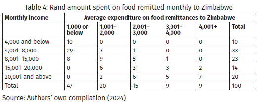 Table 4 shows that the amount spent on food transfers correlated with the average monthly earnings of this study's participants. Participants with monthly incomes below R4,000 transmitted food items valued at R1,000 or below. A considerable majority of participants with earnings between R4,001 and R8,000 also transferred food valued less than R1,000. Participants who transmitted food items valued more than R2,000 had higher earnings exceeding R8,000. Almost half (47%) of the study's participants spent an average amount of R1,000 or below, and another 20% spent between R1,000 and R2,000. Participants with incomes around R4,000 spent a quarter of their monthly earnings to transfer food to Zimbabwe.