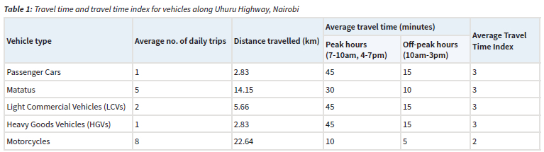 Table 1 shows the average travel time and average TTI on Uhuru Highway for five vehicle categories. The varying distances travelled by different vehicle categories is attributed to the number of trips a particular vehicle takes. The average TTI for all vehicle classes on Uhuru Highway is 2.8, meaning that a vehicle takes 2.8 times longer to do a certain trip in peak hours than in free flow traffic.