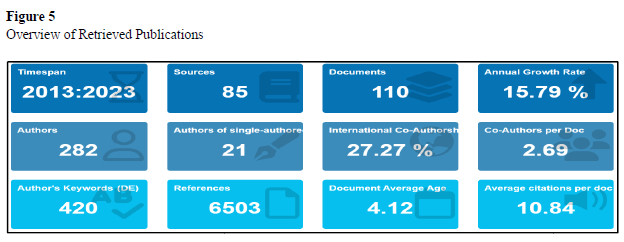 The results in Figure 5 reveal a significant growth in the research output of technology integration in South African higher education from 2013 to 2023, with an annual growth rate of 15.79%. This growth is supported by a substantial dataset comprising 110 documents from 85 sources. The documents are relatively recent, with an average age of 4.12 years, indicating the relevance and timeliness of the research. The average citation per document is high at 10.84, suggesting that the research in this field is influential and widely referenced. Collaboration among authors is prevalent, with 282 authors contributing to the documents and a significant portion engaging in co-authorship, both domestically and internationally, with an international co-authorship rate of 27.27%. Most of the documents are articles emphasizing the scholarly focus on technology integration in South African higher education. Collectively, these findings suggest a dynamic and collaborative research landscape that strongly emphasises recent and impactful scholarship in technology integration within the South African higher education context.
