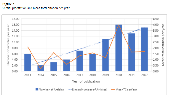 Figure 6 illustrates the annual production and mean total citations per year of articles focused on technology integration in South African higher education. The number of articles published each year shows a fluctuating but generally upward trend, with a notable increase from 2016 onwards. Peaks in production occurred in 2019, 2020, and 2022, indicating growing academic interest. This trend is supported by a strong linear relationship (R2 = 0.7709), suggesting sustained growth in research activity over time. In contrast, the mean total citations per year exhibit more variability. High citation averages in 2013 and 2020 point to particularly impactful publications during those years, possibly driven by foundational research and the global shift to online learning during the COVID-19 pandemic. The fluctuations in citation rates may reflect factors such as publication visibility, the novelty of findings, or time since publication. The data suggests a field gaining momentum in output and influence, especially in response to evolving educational technologies and contextual demands.