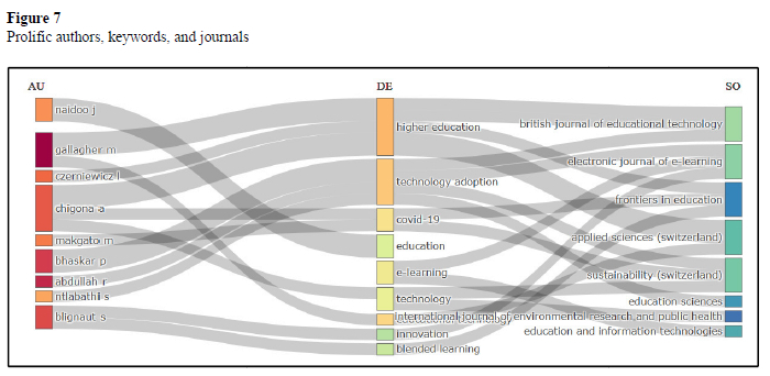 The three-field plot visually represents the relationships between prolific authors (AU), key research themes (DE), and publication sources (SO) in the context of technology integration in South African higher education. Figure 7 below highlights influential contributors such as Gallagher M, the most prolific author with three publications, followed by Blignaut S, Chigona A, Czerniewicz L, Naidoo J, and Ntlabathi S, each with two publications. These authors engage with prominent themes like higher education, technology adoption, COVID-19, e-learning, and blended learning, reflecting research's dynamic and responsive nature in this area. On the journal side, this figure identifies the British Journal of Educational Technology as the leading publication source, with nine articles, underscoring its central role in disseminating research on this topic. It is followed by the Electronic Journal of E-Learning (4 articles) and Sustainability (Switzerland) (3 articles), indicating substantial contributions to the scholarly conversation. Other relevant sources include Applied Sciences (Switzerland), Education and Information Technologies, Education Sciences, Frontiers in Education, and the International Journal of Environmental Research and Public Health, each contributing two articles. These journals span diverse yet interconnected domains, showcasing the interdisciplinary nature of the discourse. This shows a well-connected scholarly ecosystem in which leading authors, critical themes, and reputable journals converge to shape the research landscape of technology integration in South African higher education.