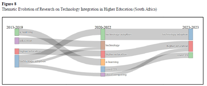 Figure 8 presents the thematic evolution of technology integration research in South African higher education across three distinct periods: pre-COVID-19 (2013-2019), COVID-19 phase (2020-2022), and post-COVID-19 (2023). Initially, technology adoption was the dominant theme, accompanied by growing interest in e-learning, education, and higher education. This early focus reflected foundational efforts to introduce digital tools into the academic environment. During COVID-19, the research focus broadened in response to the shift to remote teaching and learning. While technology adoption remained central, new themes such as COVID-19, cloud computing, and digital transformation gained prominence, highlighting the sector's adaptive response to the crisis.