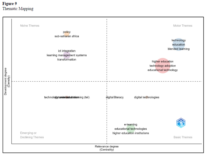 Motor themes, which are well-developed and central, include technology, education, blended learning, higher education, technology adoption, and educational technology. These reflect the sector's strategic shift towards integrated digital teaching models. Higher education institutions are advised to strengthen blended learning frameworks, and policymakers should sustain support for long-term digital transformation strategies. Niche themes, such as policy, Sub-Saharan Africa, ICT integration, and learning management systems, are well-developed but less central. These represent specialised areas offering contextual insights. Institutions and researchers are encouraged to explore these further, especially regarding regional policy contexts, while government strategies should remain sensitive to institutional and geographic disparities.
