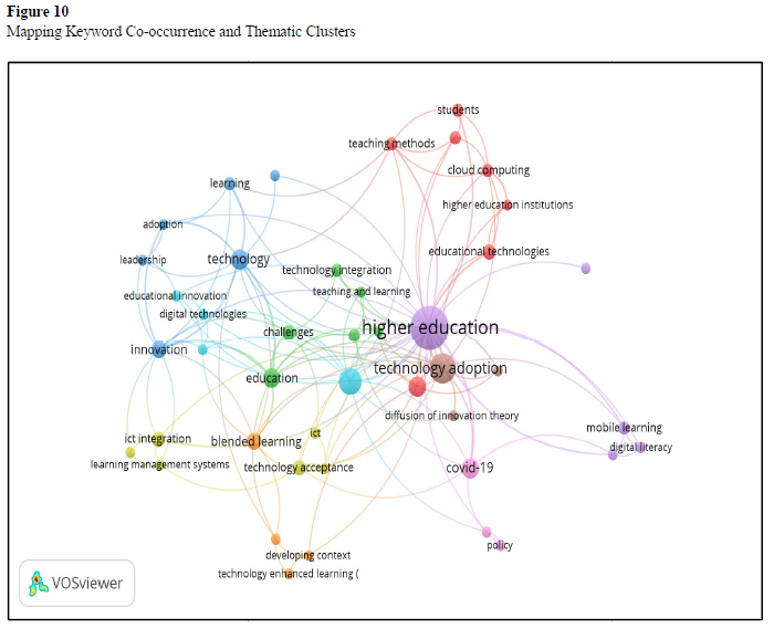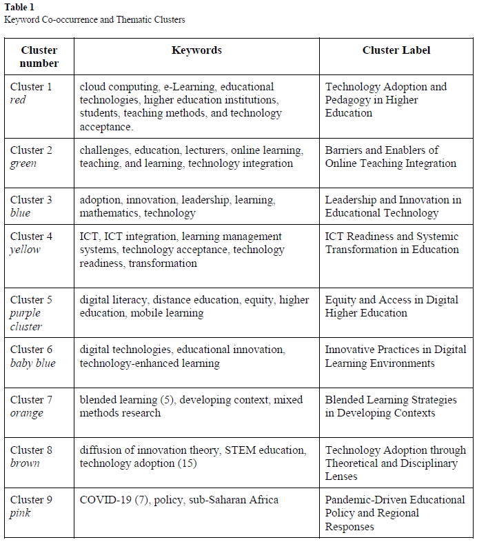 The co-occurrence network analysis in Figure 10 and Table 2 reveals nine thematic clusters that capture key aspects of technology integration in South African higher education, closely linked to national policy frameworks. The first cluster, technology adoption and pedagogy, emphasises the central role of technology in reshaping teaching and learning, aligned with the White Paper on Post-School Education and Training (2013), which advocates for blended and e-learning approaches. The findings highlight the need for ongoing pedagogical innovation to sustain digital transformation.