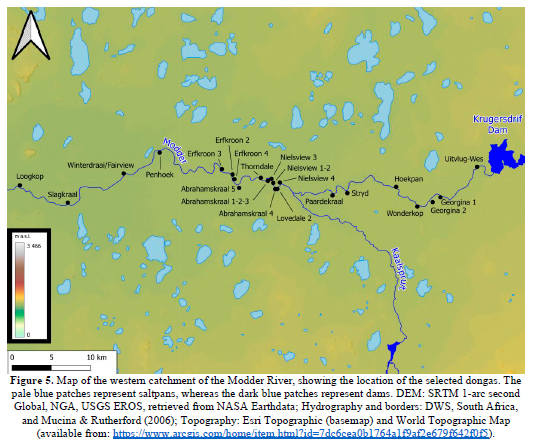 The Modder is a meandering river that flows ~370 km through the western Free State in a south-north direction from its headwaters near Dewetsdorp to Maselspoort, and then in an east-west direction until its confluence into the Riet River at Modderrivier, immediately to the west of the border with the Northern Cape (Barker 2011) (Fig. 1). Together with the Riet and the Vet-Sand, the Modder is one of the few rivers flowing in the semi-arid western Free State, which is mainly part of the Grassland Biome (Dry Highveld Grassland Bioregion) but includes also the Savanna Biome (Eastern Kalahari Bushveld Bioregion) at the border with the North West and Northern Cape and the Nama-Karoo Biome (Upper Karoo Bioregion) at the border with the Northern Cape (Mucina & Rutherford 2006).