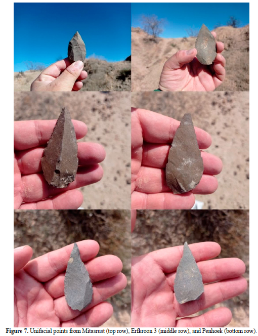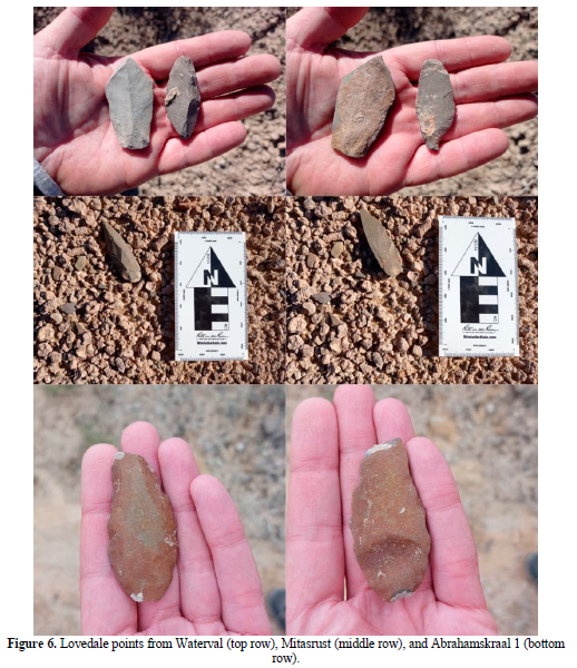 Most of the archaeological areas identified during our survey derived from, or were found embedded in, the Lower Grey Bed. Several of these (Palmietfontein 1 A1, Uitvlug-Wes A1, Thorndale A2, Erfkroon 2 A1 and A2.1, Erfkroon 3 A1, and Penhoek A3) were deposited in high-energy water environments such as channels, and as a result the artefacts are rolled or weathered. These assemblages are unfortunately less significant given the possibility of long-distance transport, even though they include diagnostic MSA artefacts and sometimes also fauna as at Penhoek A3. Other areas, on the contrary, produced well-preserved artefacts but in very small quantities: Watervalsdrift, Uitvlug-Wes A2, Abrahamskraal 4 A1 and A2, Lovedale 2 A1, Nielsview 4, and Erfkroon 3 A3 and A7. The most informative areas for the study of the MSA, which can be considered as sites based on their high density of artefacts, include Waterval A1 and A2, Mitasrust A1 and A2, Abrahamskraal 5 A1 and A2, Erfkroon 2 A2.3, and Penhoek A1 and A2. All of them contain abundant MSA artefacts, except for Erfkroon 2 A2.3 and Penhoek A2 that show lower densities of stone tools, and all of them contain associated fauna and lithics with the exception of Waterval A1 and Abrahamskraal 5, where only artefacts were found. Furthermore, Mitasrust A2, Abrahamskraal 5 A1, and Erfkroon 2 A2.3 exhibit artefacts stuck in sections created by gully erosion, and thus hold potential for the excavation of artefacts in situ.