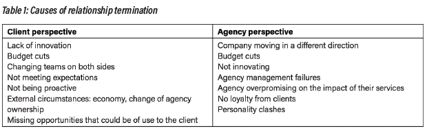 The reasons for terminating the relationships are summarised in Table 1. Generally, clients and agencies identified similar causes of relationship demise. The reasons vary and range from negative perceptions about fulfilling expectations to changes in personnel. Some of the issues had to do with the agency's performance, such as not delivering on the contractual obligations or not innovating. Others pointed to external influences such as budget cuts or the general economic climate.