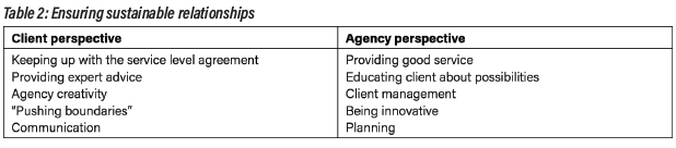 When asked about the aspects that lead to sustainability, most participants mentioned various issues related to fulfilling contractual obligations. These aspects included providing good service (meeting the clients' criteria) and providing expertise to the clients. Several agency and client participants recognised the importance of innovation. A senior consultant cited: "[B]eing bold enough to take them [the clients] into a different direction". Participant 11 observed that "being creative and pushing boundaries" are factors that lead to relationship sustainability. On a practical level, a senior account manager suggested that, to ensure innovation, teams in the agency should be rotated and assigned to different clients to provide a new perspective. Some participants mentioned the importance of regular and honest communication for the sustainability of relationships. For agency consultants, honesty meant managing client expectations about what was possible and reasonable to achieve. The main factors contributing to sustainability of relationships are listed in Table 2.