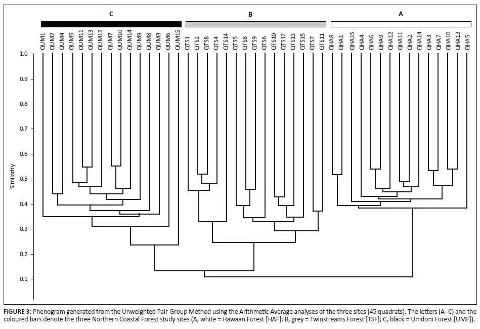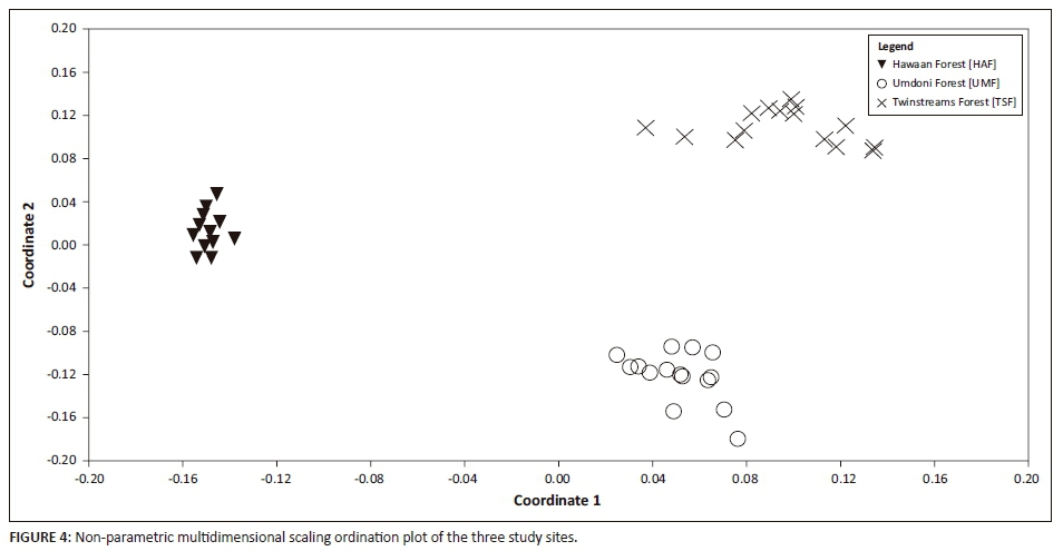 The cluster analysis and NMDS plot reflect the site differences described above. Quadrats of TSF and UMF are placed closer, while HAF quadrats were more dissimilar to those of the disturbed sites (Figure 4). It is generally expected that fragmented landscape patches closer in geographic proximity have similar species compositions, that is, they are more similar (MacArthur & Wilson 1967). Similarities amongst forest patches have in the past been attributed to the regional species pool being subjected to the same selection pressures during glacial maxima (Griffiths & Lawes 2006). Species characteristic of NCF (Gaugris & Van Rooyen 2008; Mucina & Geldenhuys 2006) were present in both primary forests (e.g. Allophylus natalensis, Brachylaena discolour, Crotalaria natalensis, Dracaena aletriformis, Drypetes arguta, Ficus natalensis, Harpephyllum caffrum, Protorhus longifolia, Teclea natalensis and Zanthoxylum capense) and also in the secondary forest (TSF). However, HAF and UMF, which are closer in geographic proximity to each other, than either are to TSF, did not cluster together. An ecosystem's stability is based on two separate but interrelated properties: resistance and resilience (Lehman & Tilman 2000). Resilience refers to the speed of recovery from disturbance, while resistance is associated with an ecosystem's ability to retain structure and composition following a perturbation and/or to regenerate. The comparisons of the floristics between a primary forest (HAF) and primary disturbed (UMF) forest conducted here suggest that certain elements of the NCF signature may be more resistant to disturbance than others.