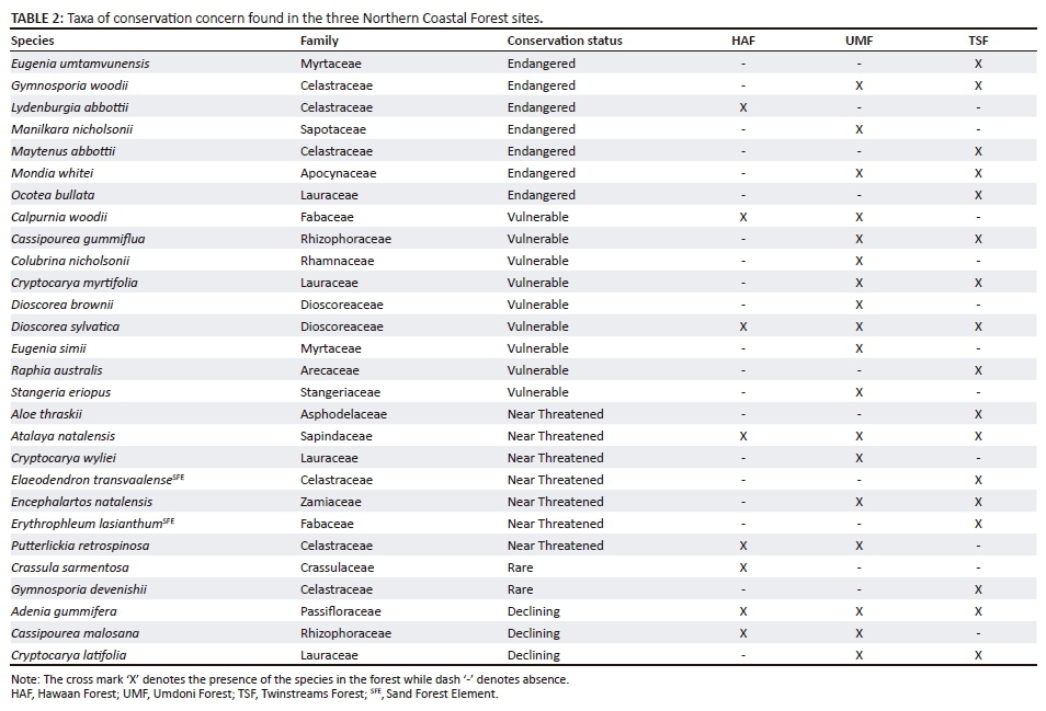 Twenty-eight species (4.07% of the total number of species found across the three forests) are of conservation concern: seven Endangered, nine Vulnerable, seven Near Threatened, two Rare and three Declining (Table 2). The lowest number of species of conservation concern occurred at HAF (n = 8), while TSF and UMF had 17 and 18 of these species, respectively. The species of conservation concern were classified according to the SANBI National Red List (SANBI 2018b), which provides fairly detailed information on species habitats and vegetation types. All 28 species of conservation concern occur across more than one vegetation, but only 12 of these are considered typical forest elements (Table 2). Only three species of conservation concern were common to all forests: Dioscorea sylvatica (Vulnerable), Atalaya natalensis (Near Threatened) and Adenia gummifera (declining). Hawaan Forest and TSF shared no taxa of conservation concern, while HAF and UMF shared three species of conservation concern. Twinstreams Forest and UMF shared six species of conservation concern (Table 2).