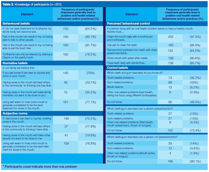 Table 4 reflects the attitudes of participants which could lead to positive oral health-related behaviour and/or practices. Although not shown on the Table, more than half (62.3%) of the responses were positive towards oral health-related behaviours with a median of 50% (range 14.3%-92.9%). The findings therefore imply that the majority of participants projected positive attitudes towards oral health-related behaviours. As predicted by the TPB, positive behavioural beliefs towards oral health lead to positive attitudes towards oral health.