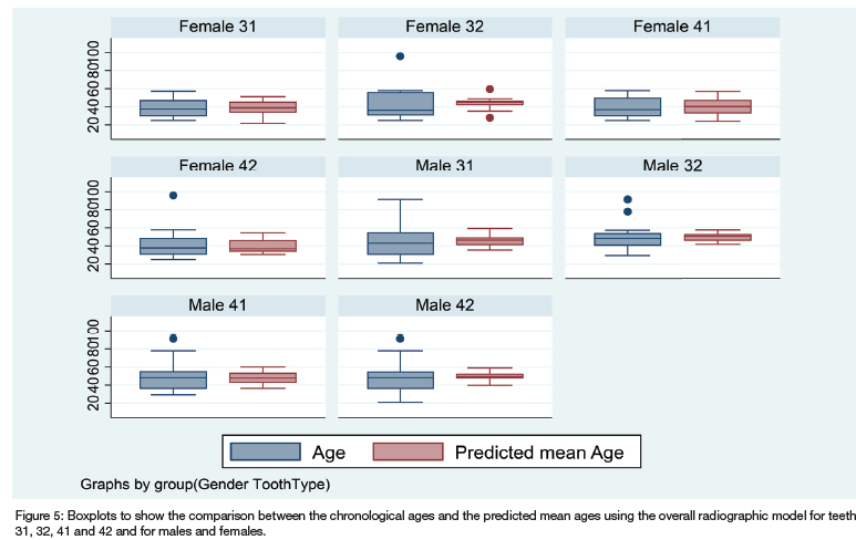 Boxplots were created to show the difference between age and the predicted mean age for males and females when the overall radiographic model is used (Figure 5).