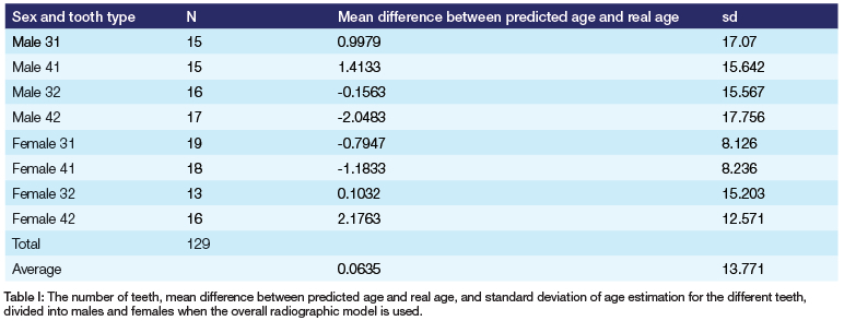 The number of teeth, the mean difference between predicted age and real age, and the standard deviation of age estimation for the different teeth when the overall radiographic model is used are summarised in Table I.