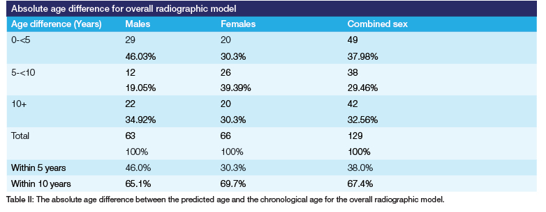 Aligned with a previous study done by Bosmans et al. (2005), the present investigation revealed slight differences when examining the comparisons. Bosmans et al. (2005) used the Adobe Photoshop® 6.0 computer program on digital panoramic radiographs. Utilising Kvaal's method, the results demonstrated a slightly less accurate prediction, with a standard error of 9.5 years.14The data obtained were analysed in three groups: male, female and the combined sex group. When the overall radiographic model was utilised, the predicted age was within 10 years of the chronological age for 65.1% of males, 69.7% of females and 67.4% for the combined sex group, as seen in Table II. The data demonstrated a statistically significant correlation between both ratios and the chronological age for all the teeth in the female group. Contrarily, no statistically significant correlation was found between the two ratios and the chronological age in the male group. The female group, therefore, appears to be more accurate than the male and combined sex group. These results are in direct contrast to a study done by Igbigbi and Nyirenda. Igbigbi and Nyirenda (2005) established that more accurate results were achieved when teeth from male individuals were utilised.15 Some of the other studies that used radiographs to estimate age did not distinguish between males and females and analysed all the teeth by tooth type.11,14,16,17 These results emphasise the significance of differentiating between various sex groups to ensure the highest level of accuracy.