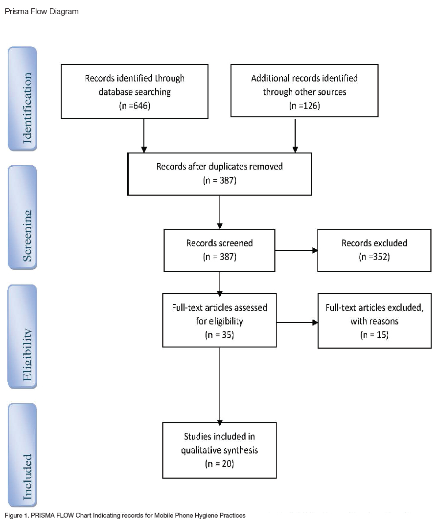 The search results are reported using a Preferred Reporting Items for Systematic Reviews and Meta-Analyses (PRISMA) flow chart, and all included studies were further evaluated according to the data extraction criteria as set out above.21-22 It was important and necessary to group articles for the mapping of included studies. The characteristics of the included studies is reported descriptively - eg publication date, geographical location and study design - and these are summarised in a table. The extracted data was interpreted to address the review question and the findings synthesised in a narrative review and mapped out on a table. The evidence synthesis or mapping using a high-level map visualising the type of disinfectants used on mobile phones in a healthcare setting was also completed. This paper is reported using the PRISMA checklist as guideline for reporting secondary research.21-22