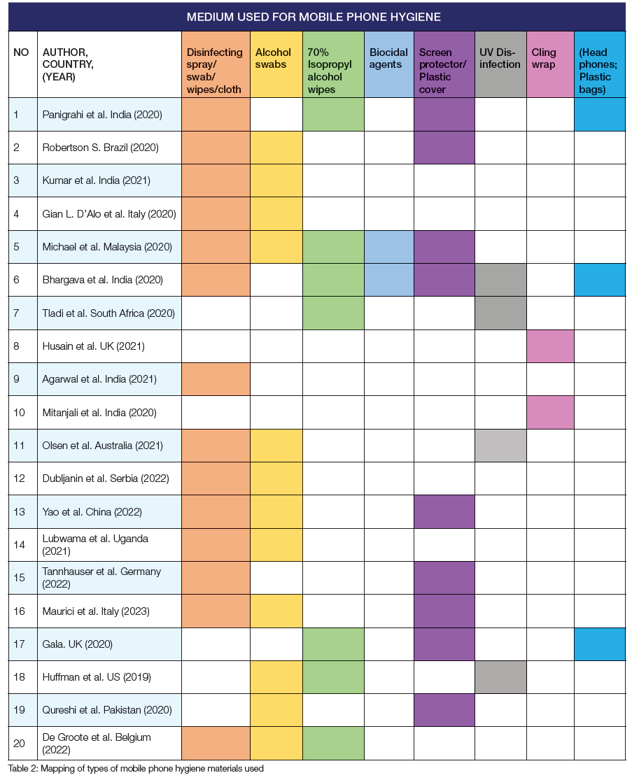 This mapping review addressed the aim of this study, and it highlights important aspects of mobile phone use in a healthcare setting. MPs have become a necessary addition to healthcare workers' daily tools used in clinics, theatres, hospital waiting rooms and when examining and treating patients. Thus, preventing or inhibiting its use while working in healthcare settings is not an option for many healthcare workers. What has transpired, though, is the extended consciousness post the Covid-19 pandemic of the transference of microbes from hands to devices and vice versa and the impact of this on health and wellbeing. Consequently, with most of the included studies for this review, hand hygiene was continuously emphasised.1,7,16-17,25,29,33,35 This aspect of cross-contamination was not mentioned by Khan et al (2022) when examining MPs of students and staff in both aerosol and non-aerosol generating clinics.12 Moreover, the increase in related research in the different settings and exploring different disinfectant media that could align with strict Covid-19 clinical protocols were also explored.