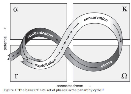 In a panarchy cycle there are essentially four phases: 1) exploitation (Γ); 2] conservation (K); 3] release/creative destruction (Ω); and 4] reorganisation (a). The cycle is key to understanding the process of adaptation. In panarchy ecological and social-ecological systems tend to form nested sets of adaptive cycles. The larger cycles are slower and constrain the faster ones. They also tend to maintain integrity, whereas the faster cycles become unpredictable and trigger off responses that may give rise to revolt.22