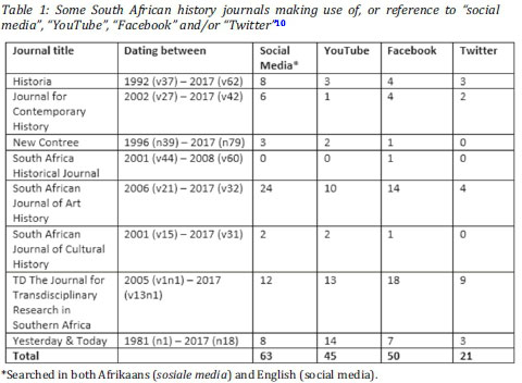 10 To learn whether modern historians have begun to include social media as a source in their research, the author has examined each of the mentioned journals carefully. The online journals were searched with the keywords: "social media", "sosiale media", "YouTube", "Twitter" and "Facebook". Also note the year of publication of each source. Because of the existence of social media prior to YouTube, the entire lifespan (as shown on the Sabinet system) of each journal was investigated.