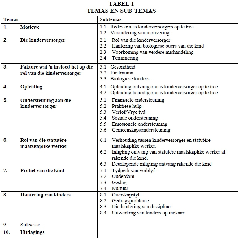 Dit het na vore gekom dat kinderversorgers se motief om betrokke te raak by privaat plekke van tydelike versorging te make het met die verskil wat hulle in kinders se lewens wou maak. Die deelnemers het aangedui dat hul motiewe om aanvanklik betrokke te raak by privaat plekke van tydelike versorging nie sodanig verander het nie maar dat hulle definitief 'n meer realistiese besef ontwikkel het van die versorging van die kinders in hul sorg. Die kinderversorger vervul 'n kardinale roi in die versorging van die kind in 'n privaat plek van tydelike versorging. Die kinderversorger is verantwoordelik om in al die behoeftes van die kind te voorsien. Negatiewe gevoelens is uitgespreek oor die biologiese ouers van die kind wat in hul sorg is. Die terminering van 'n kind se sorg in 'n privaat plek van tydelike versorging het baie emosionele reaksie by kinderversorgers ontlok.