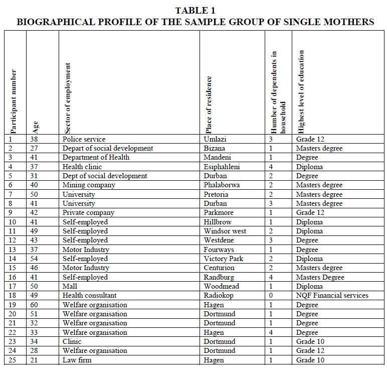 Table 1 reveals that 3 of the single mothers were aged between 25 and 30, 8 were between 31 and 40, 11 were between 41 and 50, and 3 were between 51 and 60 (N=25). The average age was 30 years. Two of the single mothers in Hagen, Germany had completed Grade 10 in secondary school, while 3 had completed Grade 12. It was commendable that 20 (80%) of the South African single mothers had completed a post-secondary qualification. Twenty-one stated that they were the sole income earners in their household, while 4 had adult children who were contributing to the income of the household. All the single mothers were heads of their households and were responsible for an average of 1.8 (N=25) dependants. An interesting finding is that 5 of the South African women were self-employed and worked on a freelance basis. The other 20 single mothers were employed either in government, higher education institutions or the private sector.