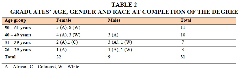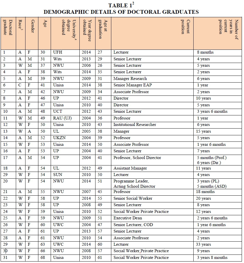 Since social work is a female-dominated profession, of the 31 doctoral graduates, 21 were women (10 Africans, 1 Coloured, and 11 Whites) and 9 men (7 Africans and 2 Whites). The ages of the participants ranged from 26 to 60 years. Five participants were employed by the government, 3 in private practice, and 23 in academia. The mean age of the graduates in 2017 was 51.29 and the mean age at completion of their doctoral studies was 44 years. This attests to the fact that most women are able to enrol and pursue doctoral studies successfully when their children were either at tertiary institutions or employed. Notably, the participants in Gardner and Gopaul's (2012:73) study indicated that few people understood the burden which ensued when attempting to strike a balance between their many roles successfully.