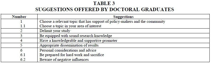 The complexity of societal needs in a new democracy requires a high level of human resources to facilitate transformation among individuals, groups, as well as in society to enhance human circumstances. This requires a distinct contribution to knowledge-building and practice through doctoral research. Six suggestions offered by doctoral graduates indicate that during preparation for this learning journey, aspirants should want to pursue viable topics they are passionate about; be ready to make a unique contribution to the discipline; disseminate and implement findings after completion of their studies; identify a knowledgeable and supportive promoter; have financial assistance; and remain emotionally disposed to engage with an intensive, rigorous programme.