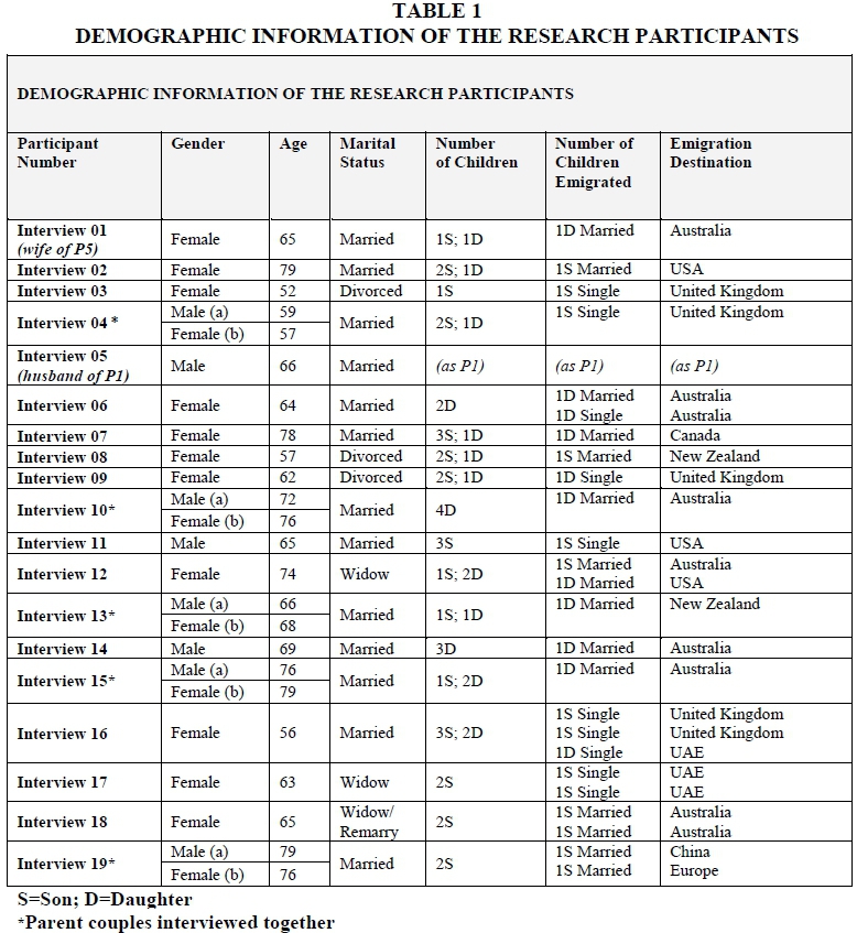 Table 1 shows the majority of participants interviewed were female (16), aged 52 to 79 years and were married (15). Six (6) of the participants had more than one child who had emigrated. Of these children only 2 sets of children, emigrated to the same destination. The other children emigrated to different destinations which lead to even more financial and other implications for the parents left behind, see interview 19 where the one child emigrated to China and the other to Europe.