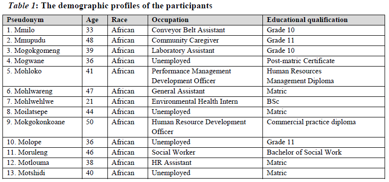 The findings are presented through demographical profiles of the participants and analysis of the themes and subthemes that emerged from the data collection. A total of thirteen African participants took part in this study, of whom nine were employed (with eight employed at the mine and one in the community). The remaining four were surviving through various self-employment activities such as running tuckshops. Four participants had post-matric qualifications (post-matric certificate, diploma or degree) and nine had high school certificates. Regarding age categories, five participants were in their thirties, six in their forties and only one was in her twenties. Table 1 below summarises the demographical data of the research participants.