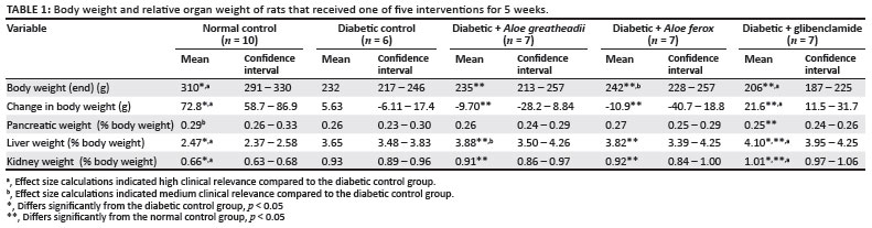 From these results it is evident that, although most of the changes that occurred in the diabetic state as a result of the two Aloe interventions were not statistically significant, A. ferox and A. greatheadii may (given the effect size calculations) show some potential for restoring hyperglycaemia through increased insulin secretion. There is therefore a possibility that a higher dosage of these or alternative extracts of the same Aloe species, given over a longer period and investigated using larger experimental groups, may result in more significant changes to the variables investigated.