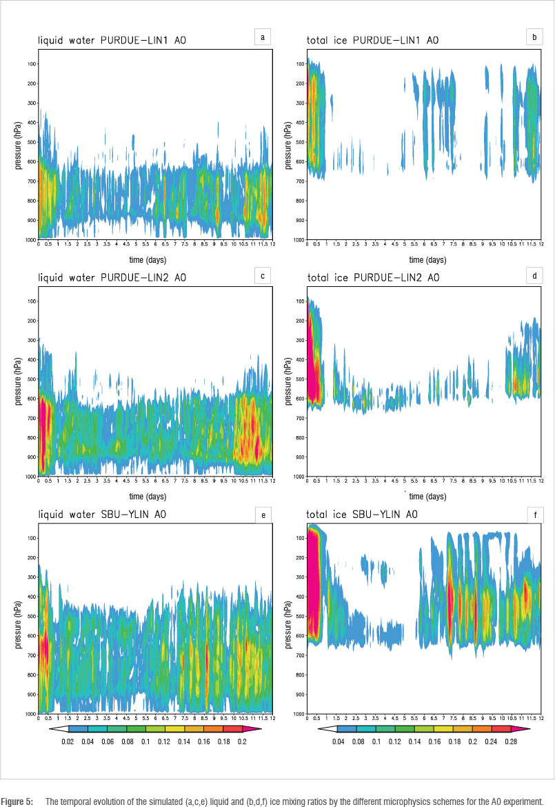 The PURDUE-LIN1 scheme acts quicker to remove cloud water and ice from the atmosphere because of the presence of graupel. This is confirmed by the amount of simulated ice by this scheme which is the least of all the schemes (Figure 5b). The SBU-YLIN hydrometeors fall slower and hence produce weaker downdrafts and cold pools. PURDUE-LIN1 simulates the least amount of liquid water, while PURDUE-LIN2 simulates the highest amount of liquid water. This difference is because graupel and rain water in the PURDUE-LIN1 simulation remove cloud water from the atmosphere faster than would be possible in the PURDUE-LIN2 and SBU-YLIN schemes. The simulated liquid water is generally deeper in the SBU-YLIN scheme simulations. The NSM is also found to adequately respond to the large-scale forcing during the spin-up period in both the B0 and C0 experiments (Figure 6).