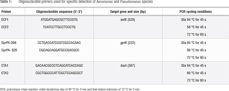 The identities of the presumptive Pseudomonas species were confirmed through amplification of the toxA24 and ecfX25 gene determinants and Aeromonas species were confirmed through gyrB23 amplification. Polymerase chain reactions (PCRs) were performed using oligonucleotide primer combinations under the cycling conditions given in Table 1. Standard 25-µL reactions that consisted of 1 µg/uL of the template DNA, 50 pmol of each oligonucleotide primer set, 1X PCR master mix and RNase free water were prepared. Amplifications were performed using a Peltier Thermal Cycler (model-PTC-220DYAD™ DNA ENGINE, MJ Research Inc., Waltham, MA, USA). All PCR reagents used were Fermentas (USA) products supplied by Inqaba Biotec Pty Ltd (Pretoria, South Africa). PCR products were subjected to 1% (w/v) agarose gel electrophoresis.