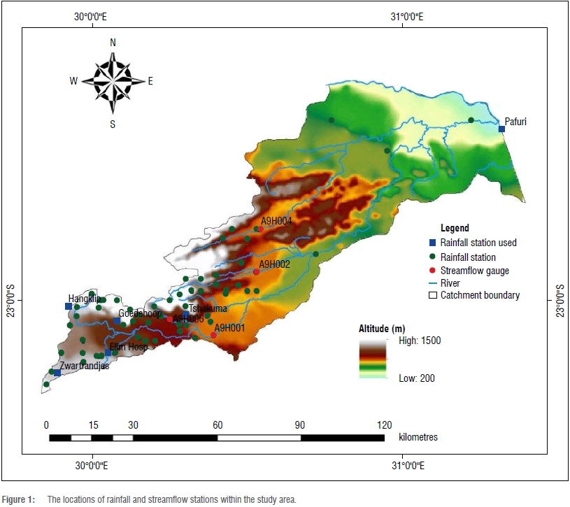 Daily rainfall data for six rainfall stations for 1931/1932-2005/2006 were obtained from the South African Weather Service and Lynch's18 rainfall database. Daily streamflow data for four stations covering the period 1920/1921-2005/2006 were obtained from the Department of Water and Sanitation. Figure 1 shows the distribution of rainfall and streamflow stations within the study area. It was essential to select stations that were spatially distributed throughout the study area. Stations were also selected based on availability of long-term rainfall data (>30 years) with minimal or no gaps. The World Meteorological Organization19 recommended a period of 30 years or longer as ideal for studies dealing with long-term changes. The selected stations had data from periods ranging from 40-86 years, with gaps in data of less than 5%.