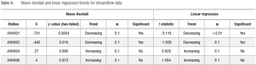 Mann-Kendall was used for trend analyses based on long-term annual rainfall and streamflow data. Mann-Kendall is a rank-based non-parametric test. The null hypothesis (H0) of the test is that there is no trend (the data is independent and randomly ordered) and the alternative hypothesis (H1) is that there is a trend.26 The Mann-Kendall test is a statistical test widely used for the analysis of trends in climatological and hydrological time series.27 It was used together with linear regression to analyse trends in long-term annual rainfall and streamflow data to show comparability of results with the results of linear regression trend analyses based on 5- and 10-year means. This comparison was aimed at showing that the latter method had merit for trend detection, which was essential for the comparison of trends identified with the Mann-Kendall method for which annual data were used. Furthermore, using more than one method for trend analysis improves on the reasonableness of the results.
