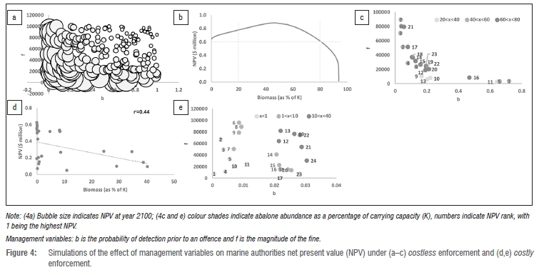 As for the baseline, a Monte Carlo simulation was employed by varying the probability of detection prior to a poaching event (b) and the magnitude of the fine (f). This simulation indicated that only 3% of outcomes resulted in a positive NPV for the marine authority. Plotting these NPVs against biomass (from an ensemble of 750 realisations - Figure 4d) shows that, in contrast with the model of costless enforcement, profits for the resource authority are highest when stocks are allowed to deplete, and decline linearly as the biological population increases in relation to its carrying capacity. The XY plot under costly enforcement (Figure 4e) indicates that NPVs are highest under low probabilities of detection (b) and lowest under high probabilities of detection (although in absolute terms these probabilities of detection are much lower than under the costless enforcement scenario). Under costly enforcement, therefore, profit maximisation results in an unsustainable abalone population compared with profit maximisation under costless enforcement, and an incentive to minimise the probability of detection prior to a poaching event, compared with costless enforcement where there is an incentive to increase the probability of detection prior to a poaching event.