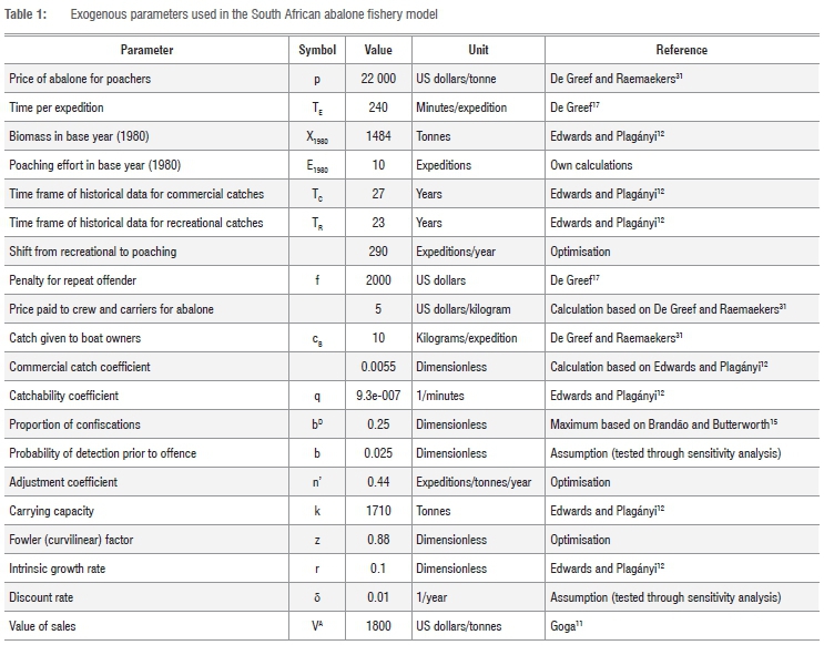 The exogenous parameters, values and references used are given in Table 1. The model equations are given in Table 3. The associated endogenous parameters are given in Table 4. The model comprises three components. The first component, the abalone population model, is a density-dependent logistic fisheries model. Fowler's density-dependent term was included to capture the effect of non-linear density dependence, following Milner-Gulland and Leader-Williams6. The logistic function has precedence in modelling South African abalone dynamics in Zone E12, thereby enabling access to specific biological parameters for this growth function. However, no known study has modelled the non-linear density-dependence factor for South African abalone. But it is possible to use optimisation to estimate the value of the density-dependent term by minimising the difference between the model data and the historical data using the historical data published in Edwards and Plagányi12, supplemented by the data in Table 1. The same technique is also used to estimate the value of the adjustment parameter n'.