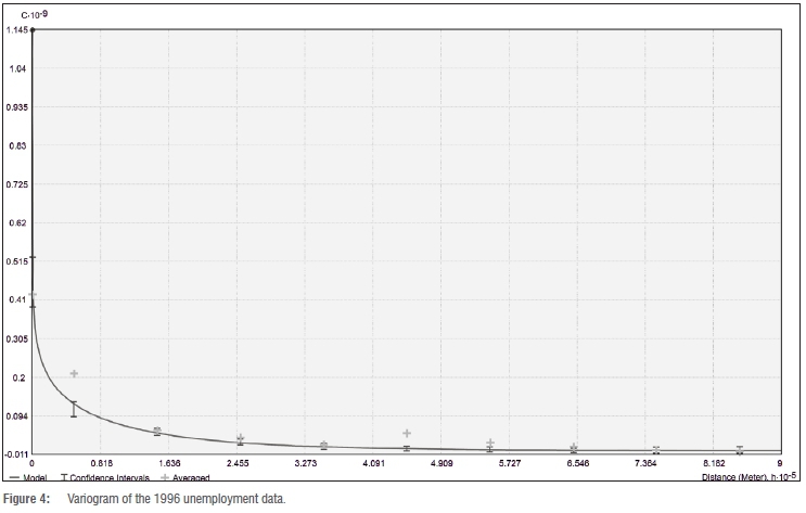 A geostatistical process of areal-based interpolation was followed and it initially created a prediction surface from the source polygons. Predictions and standard errors were calculated for all points within and between the input polygons (magisterial districts). As unemployment statistics are continuous, the input was defined as Gaussian polygonal because the polygons of collection were fairly large.31 A standard error of the predicted unemployment value was calculated for each polygon and is further discussed in conjuction with Figure 5.