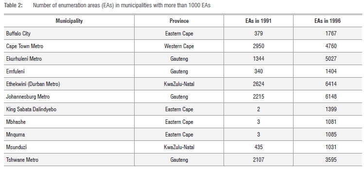 Table 2 indicates that in 1991, 5 of the 257 municipalities had more than 1000 EAs. All these municipalities were metropolitan areas. In 1996, 11 of the 257 municipalities (4.2%) had more than 1000 EAs. Besides the metropolitan areas, a number of municipalities in the Eastern Cape (including the former Transkei) and in Gauteng and KwaZulu-Natal had more than 1000 EAs each.