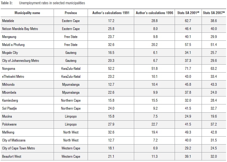 Sparsely populated areas like Matatiele (Eastern Cape) and Kamiesberg (Northern Cape) also showed stark differences in the percentages of unemployed people. The official statistics (that is, those sourced from Stats SA) show peak unemployment figures in 2001 with moderate declines in 2007.