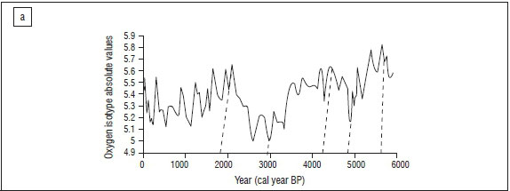 The oxygen isotope values for the Cango stalagmite are shown in Figure 1a. These values can be compared to the relative changes in Thackeray's temperature estimates for the Boomplaas sequence (Figure 1b). The implication is that there is remarkably good agreement between the raw oxygen isotope data from the speleothem4, and the calibrated temperature curve for the Boomplaas Holocene sequence, based on Thackeray's5 multivariate analysis of fossil rodents and insectivores.