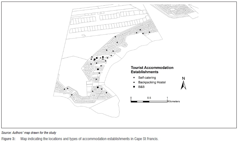 Semi-structured interviews with respondents, who were all tourism accommodation proprietors, were conducted in St Francis Bay and Cape St Francis. During the period of fieldwork, 57 establishments existed in St Francis Bay (Figure 2) and 31 in Cape St Francis (Figure 3).
