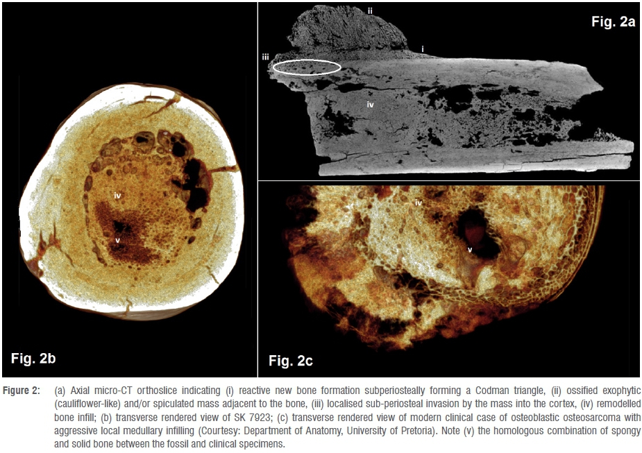 The bone was examined using micro-focus X-ray computed tomography (μΧCΤ) at the South African Nuclear Centre for Radiography and Tomography (located at the South African Nuclear Energy Corporation, NECSA). The bone was scanned by F.d.B. and J.W.H. using a Nikon XTH225STμXCT system, at an energy potential of 100 kV and resolution of 17 microns. Reconstruction was performed by E.J.O. and PR.Q. using Avizo Amira 5.4 to generate both 2D orthoslice and 3D surface rendered views. The cross-section shows that the hemispherical mass is not fully fused to or integrated with the cortex, but adheres to the bone surface, displaying an irregular spongy woven bone texture with a cauliflower-like external appearance (Figure 2a). The cortical bone directly underlying the mass is covered with a thin layer of new woven bone, with a Codman triangle displayed at the margins. The texture is granular and exhibits ellipsoid lytic lesions in transverse view. There is localised sub-periosteal invasion by the mass into the cortex (Figure 2a). Surprisingly, μXCT showed much of the medullary cavity to be infilled with bone, with clear internal remodelling and de-novo bone formation (Figure 2b). Inside the cortex are several irregular and large circular voids, caused by bony encapsulation of normal vascular channelling found within the endosteal surface of the medullary cavity. The remaining medullary space is obliterated by new bone growth.