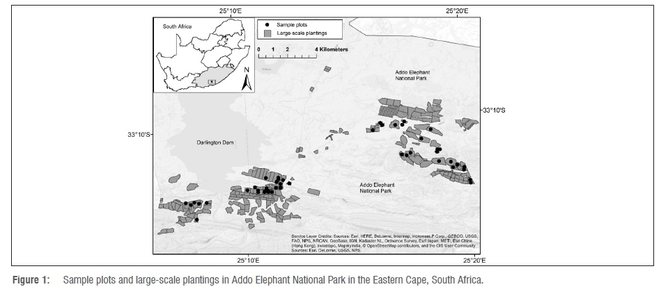 Through the Subtropical Thicket Restoration Programme (STRP), about 21.5 million cuttings of spekboom (Portulacaria afra) were planted over the period 2004-2016 in the Addo Elephant National Park, Great Fish River Nature Reserve and the Baviaanskloof Nature Reserve. This planting includes a large experiment of 330 quarter-hectare plots in which 14 different planting treatments were used.1 These experimental plots, known as the 'thicket-wide plots', comprised 200 000 cuttings, with the remaining 21.3 million cuttings planted out in what were called the 'large-scale plantings'. Some of the large-scale plantings were replanted with cuttings - a procedure referred to as blanking. The positioning and number of cuttings used in each blanking operation was not recorded and consequently the surviving cuttings in any particular landscape within the large-scale plantings cannot be aged accurately. Notwithstanding the limitation of many sites in the large-scale plantings made up of cuttings planted in different years, we saw value in monitoring survivorship of cuttings in random plots within the large-scale plantings, simply to determine the likely outcomes of the South African government's investment in planting 21.5 million cuttings over the past 12 years.