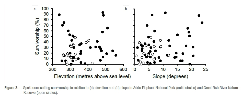 In June and November 2015 we collected survivorship data in large-scale plantings from 47 plots in Addo Elephant National Park and 17 plots in Great Fish River Nature Reserve (Figures 1 and 2). We used the STRP database hosted by the Gamtoos Irrigation Board in Patensie (Eastern Cape) to identify appropriate areas for sampling across a range of topography and geology. At each plot (20 m by 20 m) we counted all living cuttings and estimated survivorship using the assumption that each plot had originally contained 100 cuttings. This assumption was based on the standard STRP planting protocol of planting cuttings 2 m apart, i.e. 2500 cuttings per hectare. It should be noted, however, that depending on the rockiness of a particular landscape, the distance between cuttings - and consequently the original number of cuttings in each of our study plots - would have varied.