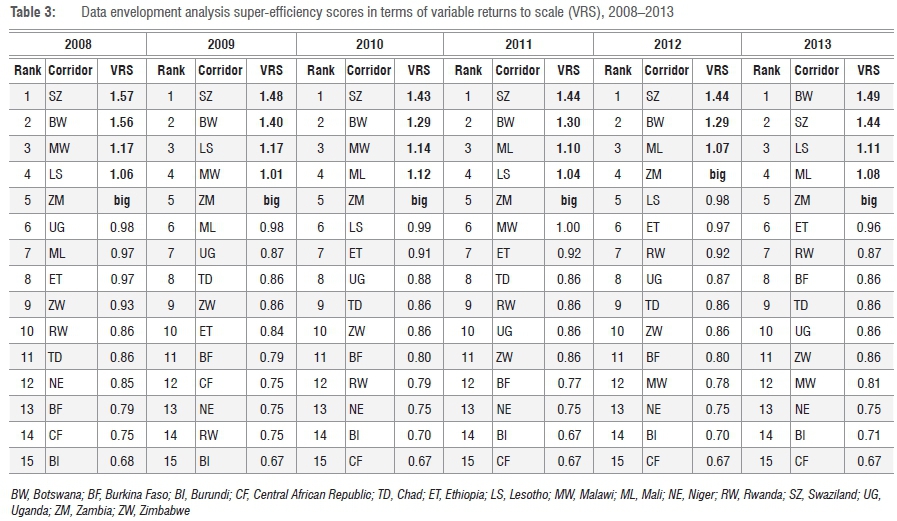The results on CRS efficiency indicate that Botswana and Zambia have the most successful corridors, but in terms of VRS more than two corridors showed efficiency (five countries in 2008 to 2011, four in 2012, and five in 2013). To determine the best performing corridor in the study, we applied super-efficiency in VRS terms. The results are depicted in Table 3. Super-efficiency DEA allows efficiency scores greater than 1.00 (i.e. bigger than 1.00 for input-oriented model) and enables the ranking of DMUs using the level of efficiency. Further discussion of the rankings is in relation to the results from applying super-efficiency.