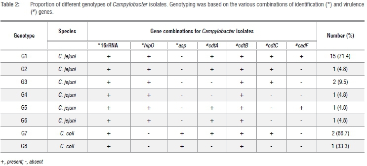 It is worth noting that the agropastoral industry is fast developing in South Africa in particular and in sub-Saharan Africa in general. Unfortunately, animals intended for human consumption are often natural reservoirs for pathogenic bacteria in humans. Infections with thermophilic Campylobacter present with severe complications in humans. Despite these health impacts, there are limited data on the prevalence of Campylobacter in clinical, environmental and food products in southern Africa.22-25 There is a need to exploit other sources, particularly animal species that are natural hosts of Campylobacter species, for the presence of potentially virulent strains. The present study was designed in order to isolate campylobacters from chicken cloacal samples and to determine the virulence profile of the isolates. Although other genes are responsible for the expression of pathogenicity in Campylobacter, the cdt gene subtypes (A, B and C) responsible for the expression of the cytolethal distending toxin and the cadF gene expressing products of adhesion were selected as targets for the present study.