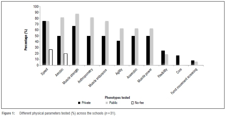 According to the coaches' responses, the most commonly tested measure was speed (58%), which remained the most popular for private schools (75%) and no-fee schools (27%) alike (Figure 1). The public schools indicated a preference for testing muscular strength (88%), with the only other parameter tested by no-fee schools being aerobic capacity (Figure 1). Overall, the most common tests were for speed (40-m and 100-m sprint tests), aerobic capacity (multi-stage fitness test), anaerobic capacity (repeat sprint ability test), muscular strength (one-to-five repetition maximum test), muscle endurance (maximum push-up, pull-up and sit-up tests), agility (Illinois agility test), muscle power (standing broad and vertical jump tests) and flexibility (sit and reach test).